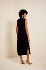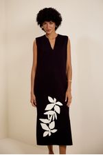 Vestido malha de viscose sustentável proveniente de fontes renováveis, modelagem reta, decote v, sem manga, leve fenda lateral e detalhe silk floral frontal. modelo veste tamanho p.