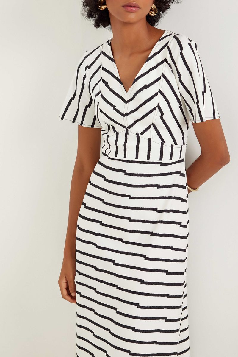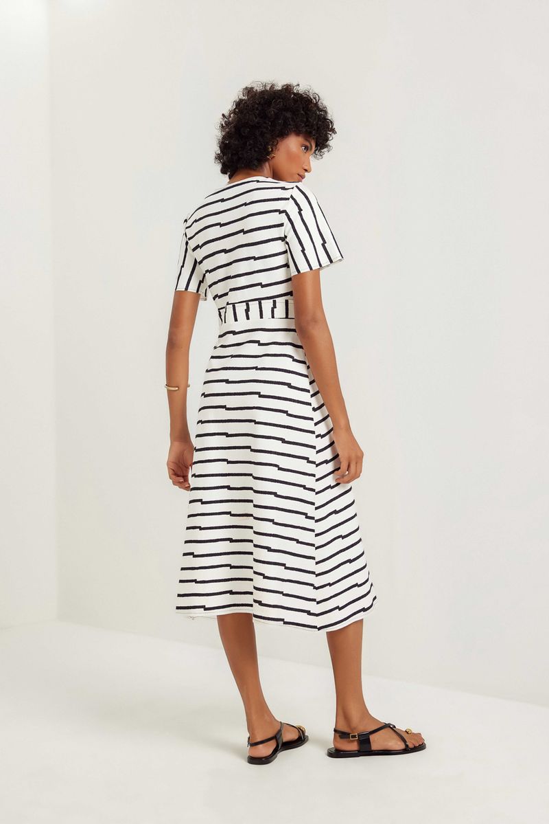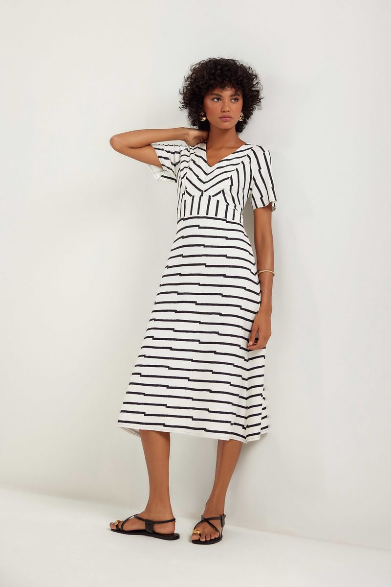 Vestido malha de viscose sustentável proveniente de fontes renováveis estampa listra pb, modelagem evasê, decote v com recortes e detalhe busto, manga curta, acabamento a fio e comprimento midi. modelo veste tamanho p.