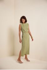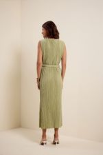 Vestido em malha plissada, modelagem reta, decote redondo, sem manga e cinto com elástico e fivela. modelo veste tamanho p.