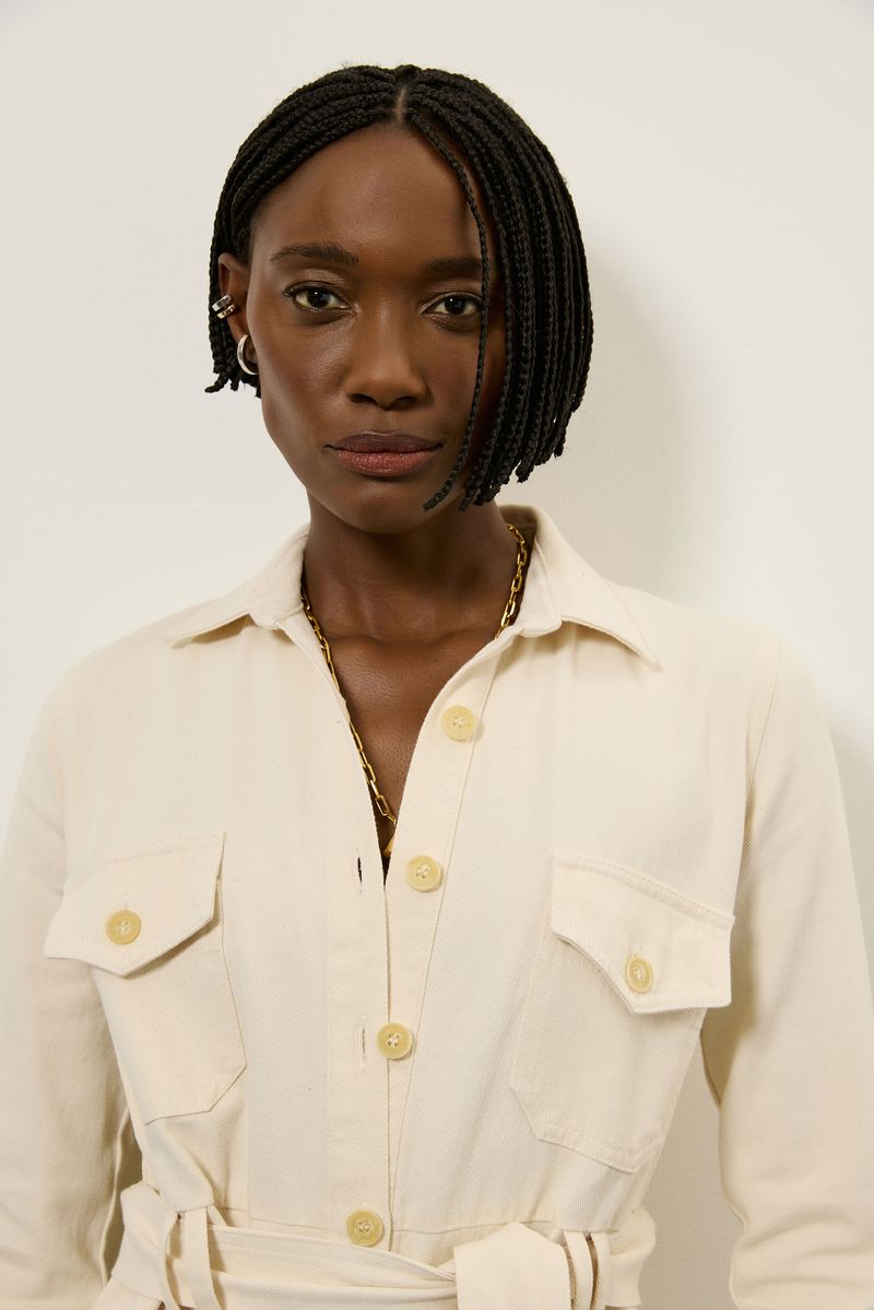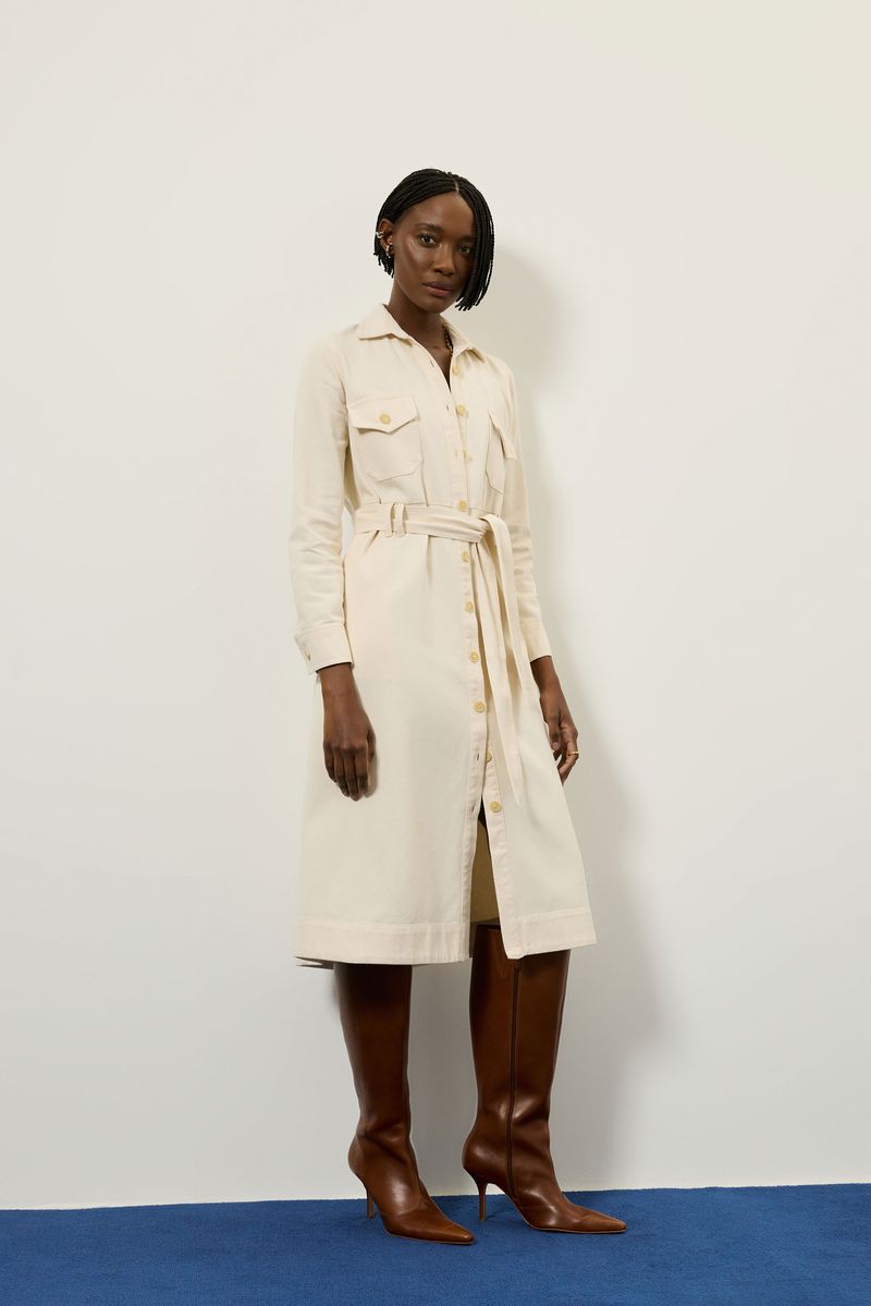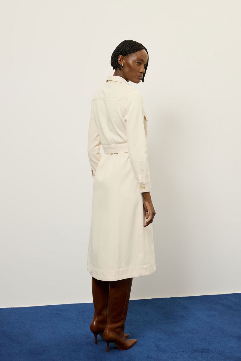 Vestido de tecido plano em sarja 100% algodão, tipo chemise com comprimento midi, manga longa com prega e abotoamento no punho, passadores, bolso frontal e fechamento por botão. peça acompanha faixa do próprio tecido. modelo veste tamanho 38.