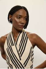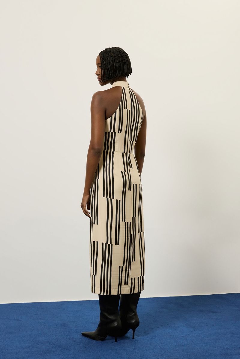 Vestido de tecido plano em viscose estampa partituras, modelagem ajustada ao corpo, decote v com falso transpasse frontal e detalhe pregas, sem manga e comprimento midi. peça forrada. modelo veste tamanho 38.